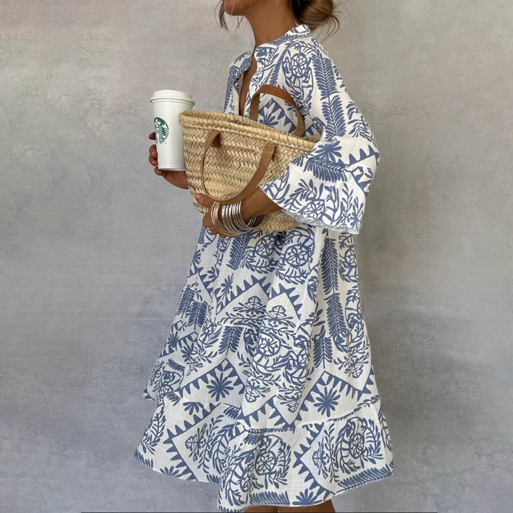 Mit seinem auffälligen blauen Muster auf hellem Hintergrund vereint dieses Maxikleid mediterranen Flair mit moderner Stil. Die weite Silhouette und die langen Ärmel sorgen für eine luftige Passform, perfekt für warme Tage. Ob am Strand, beim Stadtbummel oder beim Wochenendbrunch – dieses Kleid bringt lässige Eleganz in jeden Sommertag.