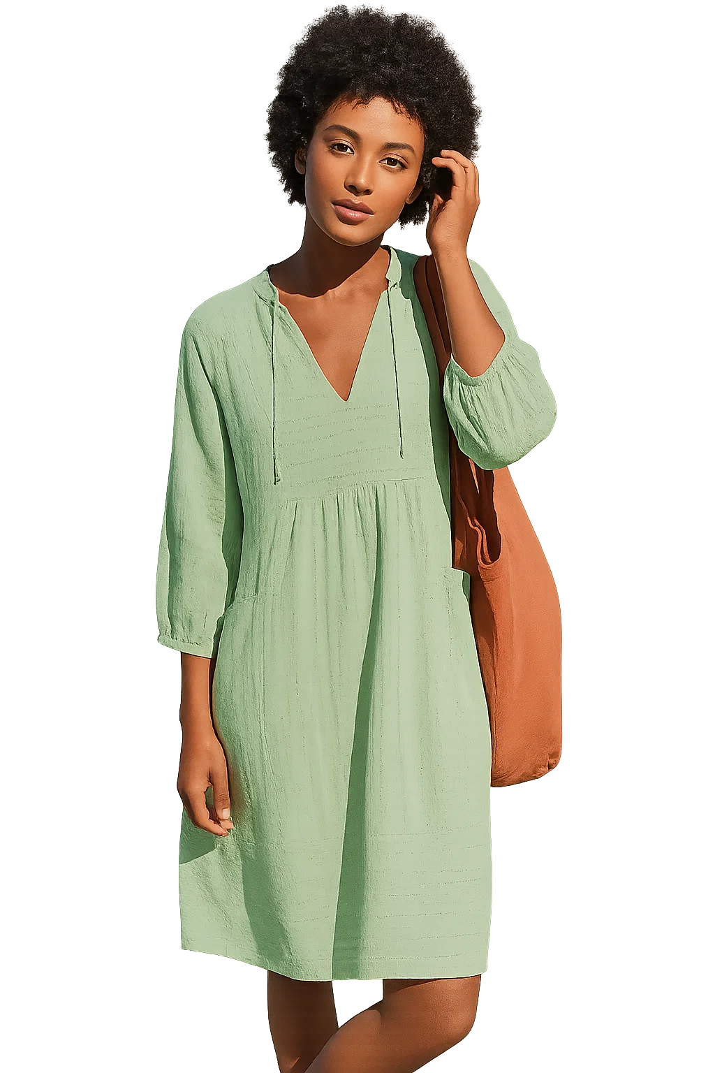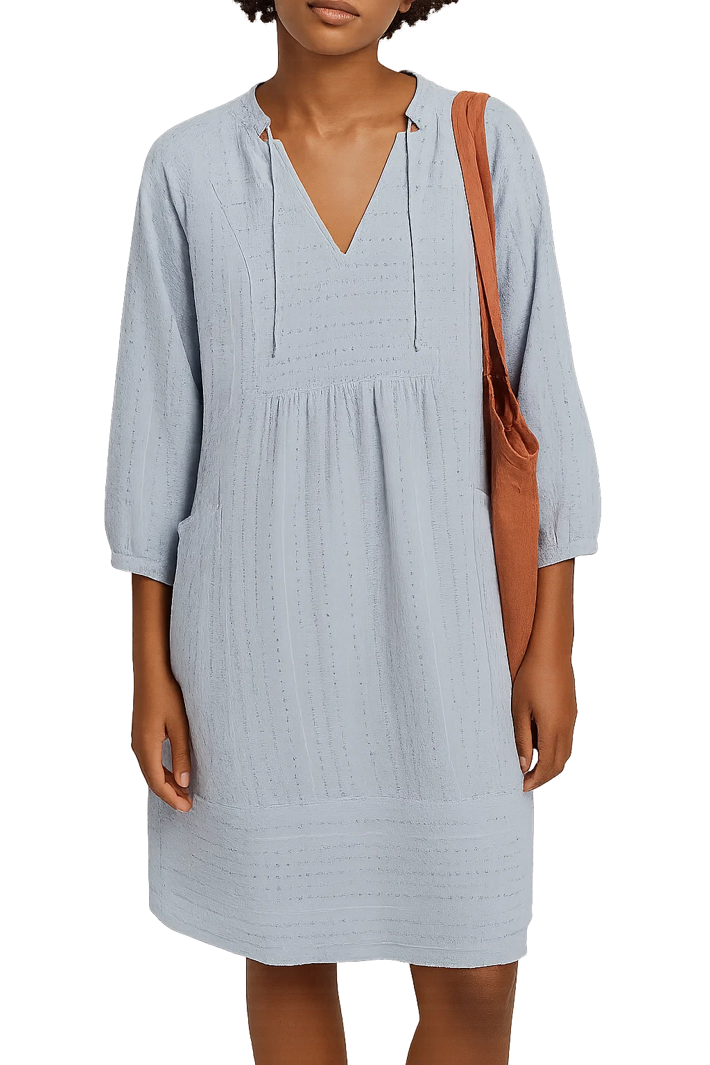 Dieses luftige Strandkleid in lockerer Passform ist ideal für warme Tage am Meer oder entspannte Spaziergänge an der Promenade. Der V-Ausschnitt mit Bindebändern und die praktischen Taschen unterstreichen den unkomplizierten Sommer-Stil.