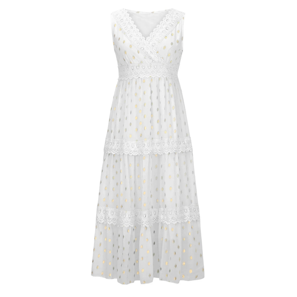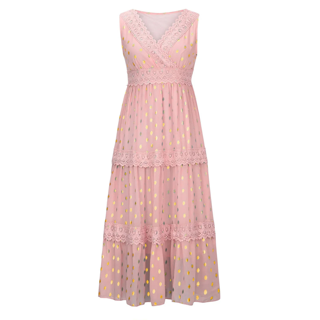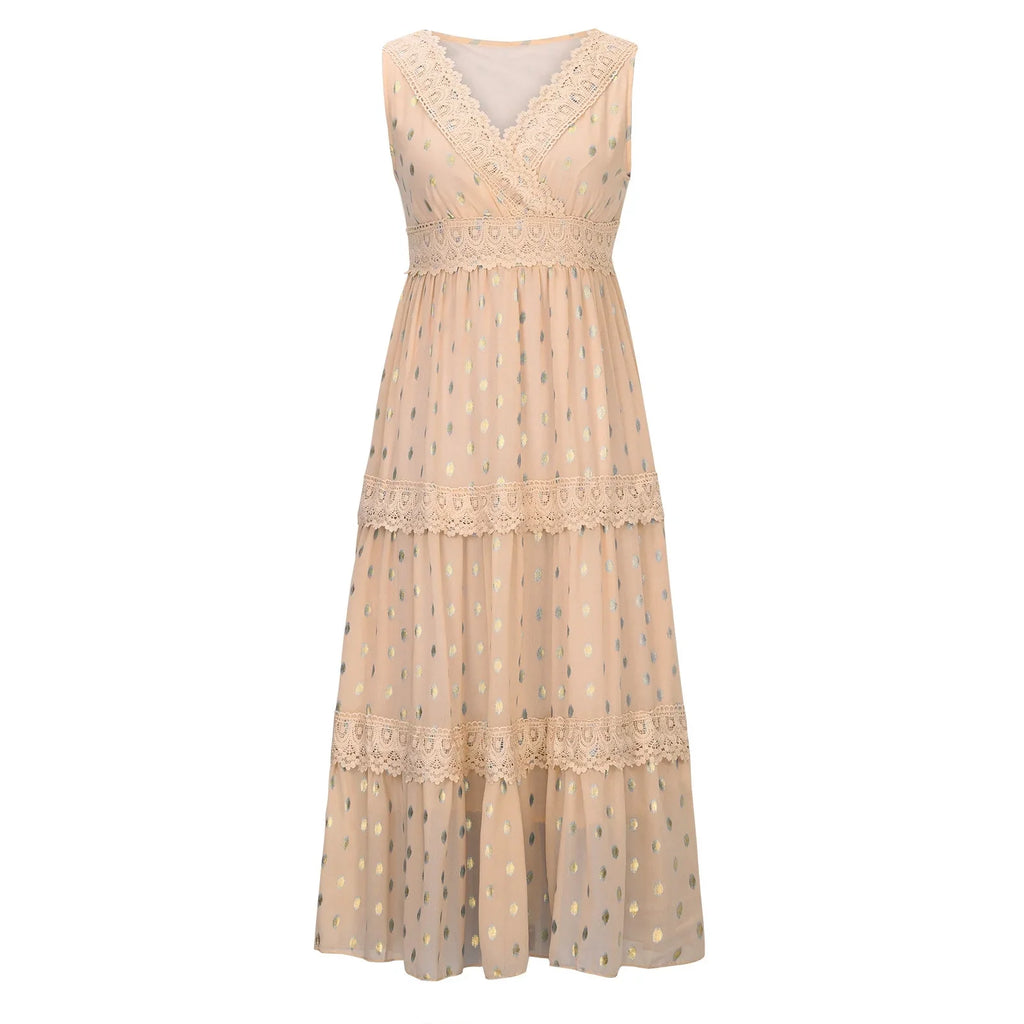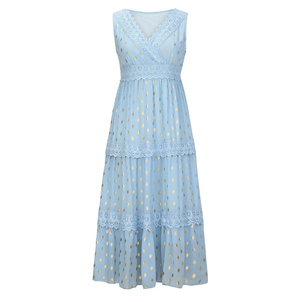 Das Damen Verspielte Boho Maxikleid bringt sommerliches Flair in deinen Aussehen. Mit zarten Spitzenakzenten, einer Weite Passform und einem sanften Muster ist dieses Kleid perfekt für entspannte Tage, Strandspaziergänge oder Festivals im Freien.