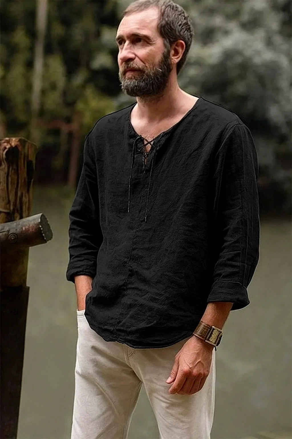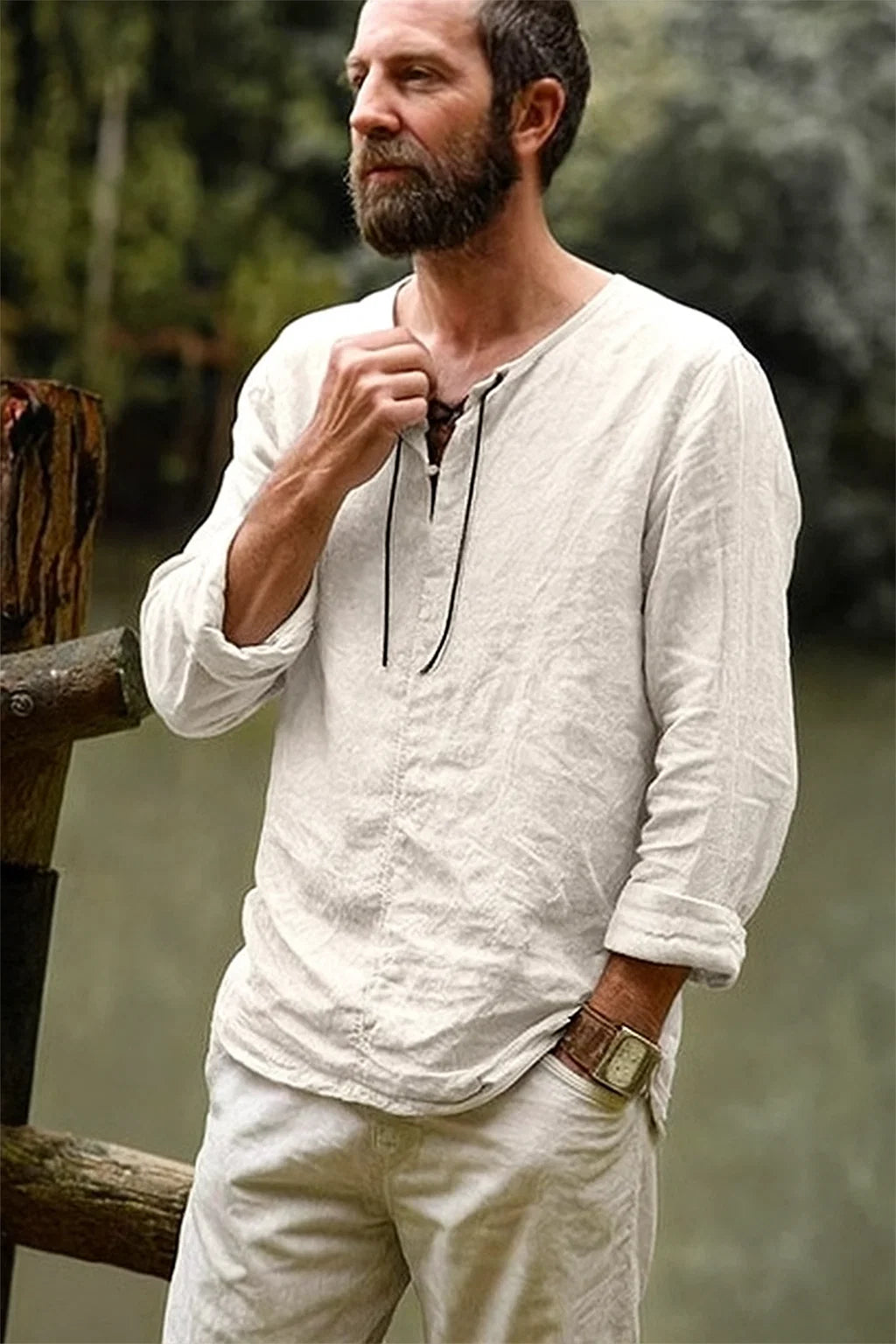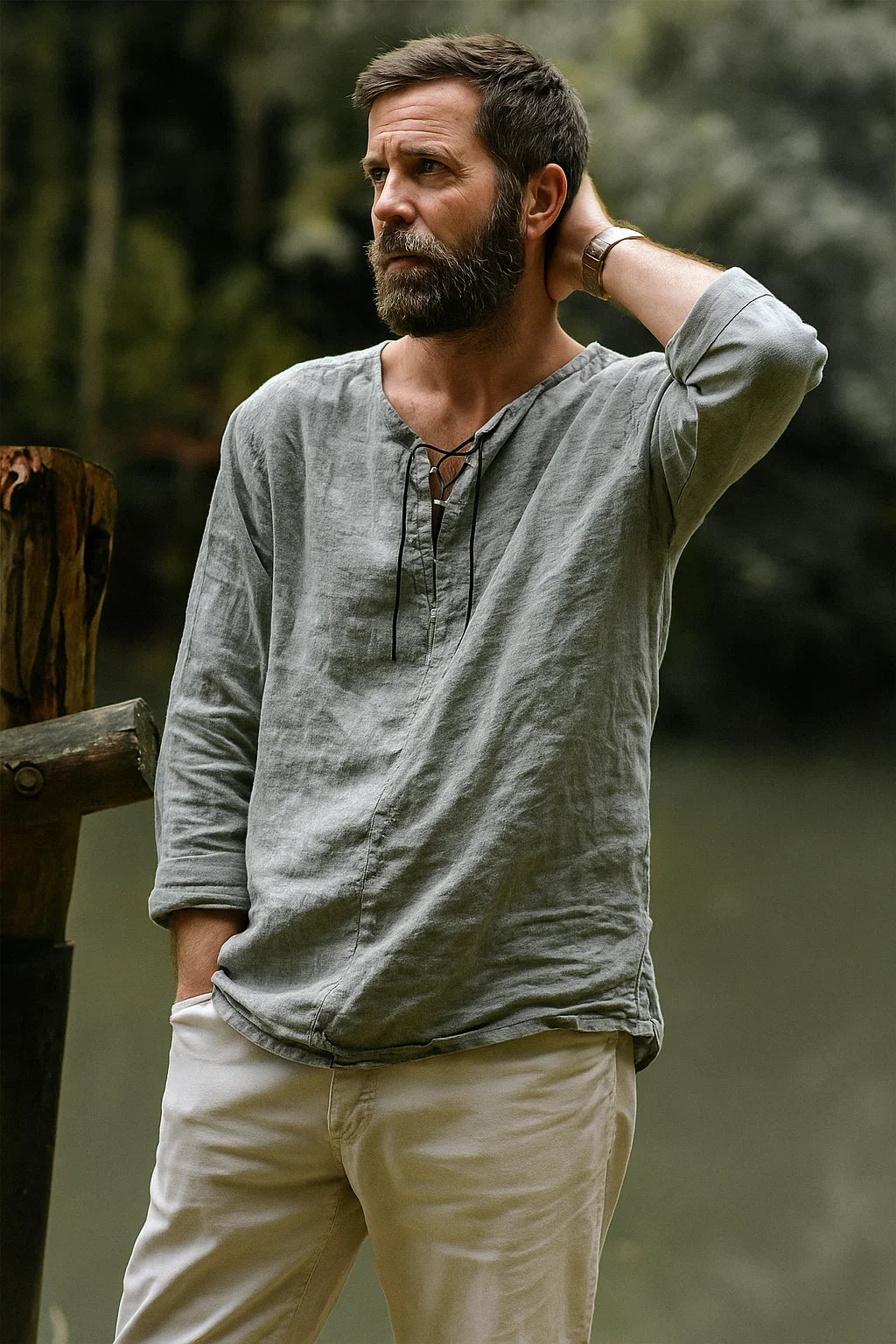 Beschreibung: Das Herren-Klassiker-Langarm-Sommerhemd bringt einen zeitlosen Aussehen in deine Garderobe. Mit seinem lockeren Schnitt und der Schnürung am Ausschnitt vereint es rustikale Elemente mit lässiger Alltagstauglichkeit. Ideal für entspannte Tage draußen, auf Reisen oder für legere Freizeit-Outfits.
